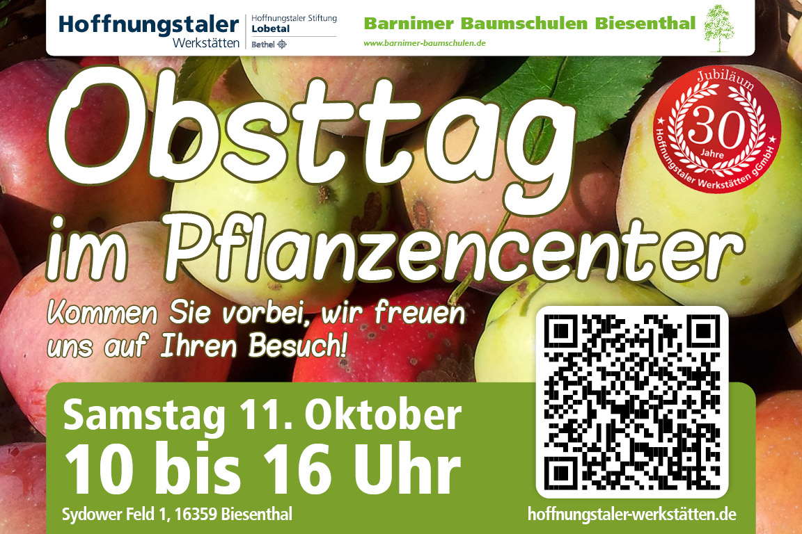Am 11. Oktober 2025 findet im Pflanzencenter der Hoffnungstaler Werkstätten in Biesenthal der jährlich wiederkehrende Obsttag statt. Zwischen 10:00 und 16:00 Uhr können Sie Äpfel verkosten, mitgebrachte Apfelsorten bestimmen lassen, eine Pilzausstellung begutachten und sich über Saatgut vom Verein Vern informieren.